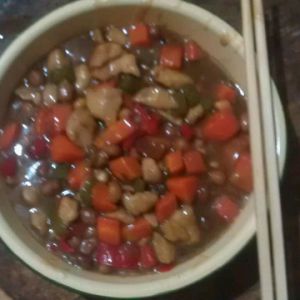 放入花椒,炒出味道捞出不用,炒姜蒜葱,倒入鸡丁,翻炒一会,倒入胡萝卜,炒一分钟,倒入青红椒,炒一会。倒入芡汁。炒至熟。即可乘出