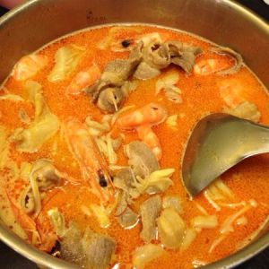 用温水将冬阴功汤料调开,和咖喱一起加入正在煮的汤里,待汤烧滚