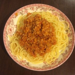 再次在锅中放入黄油,融化后,放入切碎的洋葱丁,西红柿丁和蒜泥,炒香后倒入番茄酱,调入黑胡椒和生抽后,差不多熟了之后,倒入牛肉馅,再翻炒一下,即可出锅,意大利面酱即完成。
