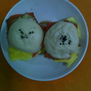 蒸好的馒头拿出来,在另一半抹上黄豆酱,把刚才烧好的青菜、肉、胡萝卜、煎蛋、西红柿各加一片叠上去,在盖上另一半馒头就可以吃了。