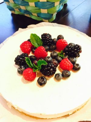 黄油室温软化,消化饼装入保鲜袋碾碎至碎粒备用,将消化饼屑与黄油搅拌混合,并平铺在可脱卸蛋糕膜具底部