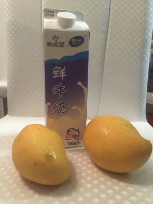 我选择的是当季的芒果,叫不出具体名字,甜度很高的!牛奶我用的是新鲜牛奶!量可以根据吃的人数确定!我用的是三个芒果,半盒多的牛奶!