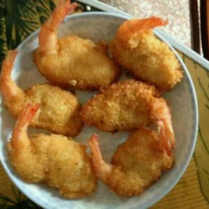 把虾粘上一层蛋液,再裹上一层面包糠,以次类推!