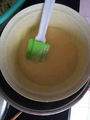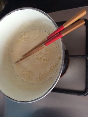 锅重新用小火加热,边加热边不停搅拌,直到面糊沸腾,变得浓稠后,立即离火