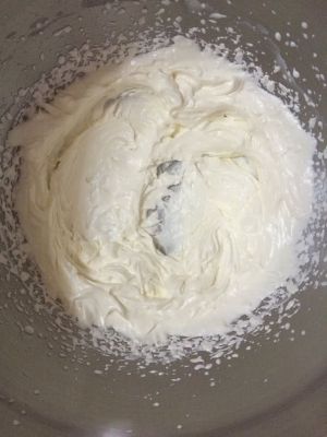 当蛋乳泥变得冰凉以后,把100ML的动物性淡奶油打发到可以保持花纹的状态
