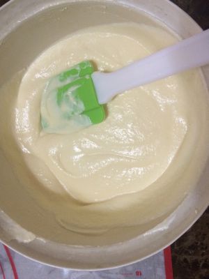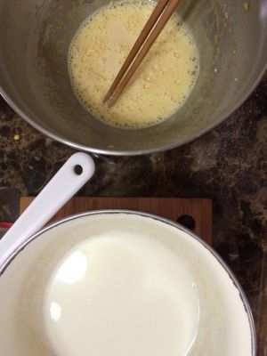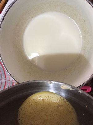 牛奶加糖,倒入奶锅里煮至沸腾,把煮沸的牛奶缓缓的倒1/3入第三步做好的蛋黄面糊里,边倒边不停的搅拌,防止蛋黄面糊结块