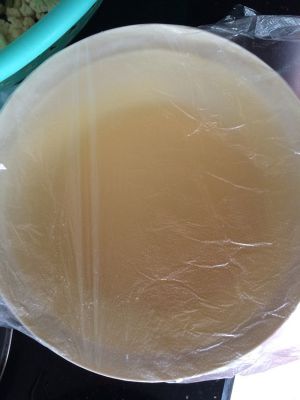 搅拌到蛋乳泥差不多冷却的时候,用保鲜膜盖起来,放在冰箱里