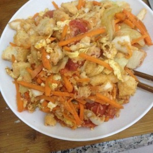 炒至红萝卜生菜略软加入馒头,翻炒几下,待馒头炒均匀即可出盘,色香味俱全