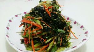 加入海带、黄瓜、胡萝卜再加入小调料盐、鸡精、一点点的生抽、白糖和醋多加点(可以先尝尝再一点点的加调料)