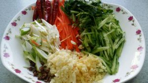 黄瓜、胡萝卜切丝,香菜切段,大葱切片,蒜姜切末。花椒、干辣椒备用。
