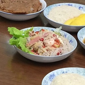 做调料: 洋葱,蕃茄,辣椒,大蒜,放入小盆子,加入白糖少量,鱼露,白醋少量,柠檬汁,腌大蒜带汁,混合搅拌(具体味道要自己边试边调)