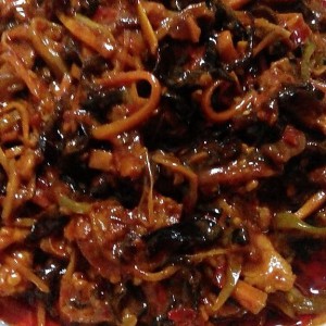 放入郫县豆瓣炒香,倒入胡萝卜,木耳,尖椒,葱丝,翻炒