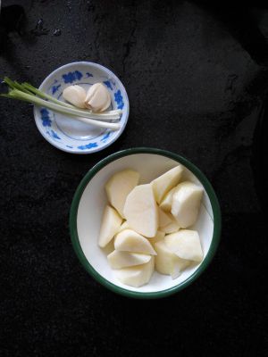 土豆去皮切块,大蒜去皮。
