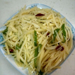 热锅凉油,倒入土豆丝,姜蒜,红辣椒,翻炒,有稍微多一些