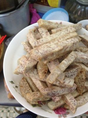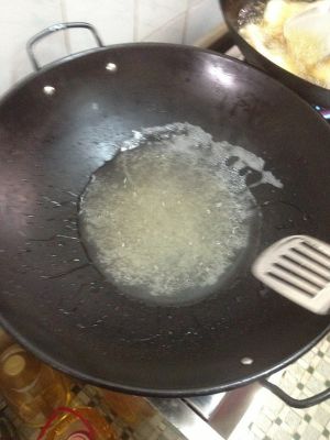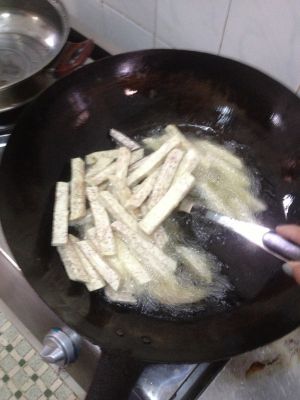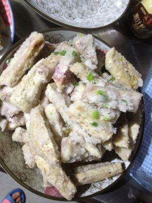我换锅熬糖的(可不换'把刚炸香芋的油到起)加水!下糖!熬到有粘稠感!下葱!关火!把炸好的香芋倒入(翻炒均匀)