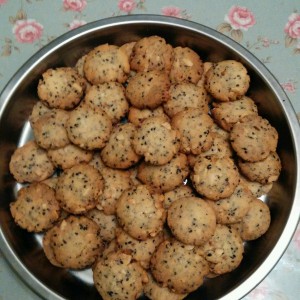 黄油软化后加入糖粉、蛋黄,用打蛋器打发至体积蓬松。筛入低粉,用橡皮刮刀翻拌圴匀成为面糊,加入打碎的花生、黑芝麻和椰蓉,用手揉匀成为饼干面团。