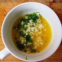 小葱,蒜切末。黄油切块,放锅里面隔水加热成液体。黄油中加入葱末,蒜末,盐,黑胡椒,搅拌均匀。
