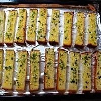 用刷子粘黄油蒜酱刷面包条上,摆入烤盘。
