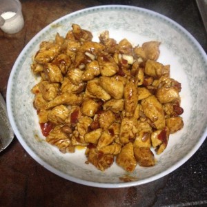 热锅放入油之后,放入辣椒炒香放入豆瓣酱,老抽,糖,料包中有鸡精,为了健康我忽略了,炒料时候加入一点清水,然后放入鸡丁和花生,就那么简单一盘宫保鸡丁出锅啦!