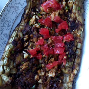 辣椒、蒜、葱切细均匀的撒在茄子上,抹上肉酱,用小勺把酱油均匀的撒在茄子上,放入微波炉微波5分钟后,放入番茄粒再微波20秒,美味茄子就成功出炉了。