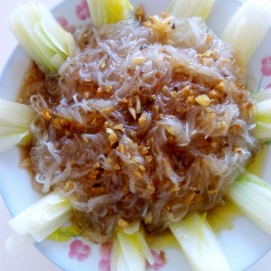 粉丝煮软后放在之前摆好的娃娃菜上,把蒜沫油全浇在上面,放在锅里蒸,大概5分钟。