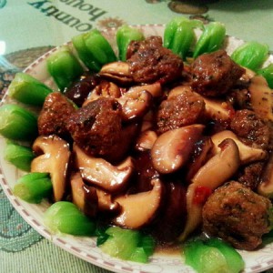 加入生抽,蚝油调味,然后倒入水和淀粉调成的水淀粉,翻炒一会然后放入豆腐丸子,翻炒几下大火收汁。
