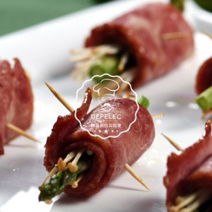依次将培根肉卷起,最后结尾处用牙签贯穿过培根卷,并均匀的刷上橄榄油。