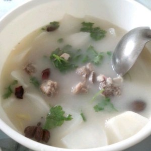 待水大开以后倒切好的萝卜,继续煮10多分钟,如果觉得水有点少的话就倒入开水,不能用凉水。