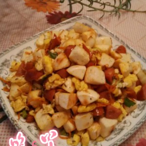 将大葱切成葱花,火腿肠切粒儿,胡萝卜洗净切丝。材料可以随意搭配哦