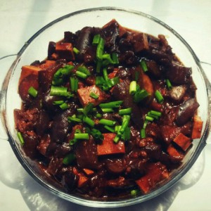 小火慢熬,待茄子变软,酱黏稠后出锅。装入容器,撒上些绿色小葱即可。