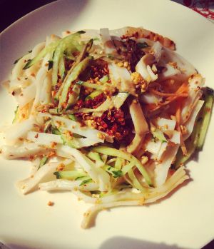擦干披萨盘重复步骤3、4制作凉皮,这个量制作大约6张凉皮,厚薄根据自己喜好调整,大汤勺就是饭店里盛汤的那种,一勺做出来很薄,黄瓜切丝、绿豆芽焯水、胡萝卜切丝,花生碎用油炒一下,麻汁用温水调开,放盐、生抽、醋调匀,浇在凉皮上拌匀装盘即可