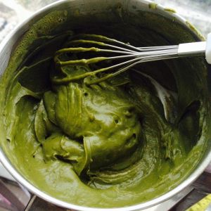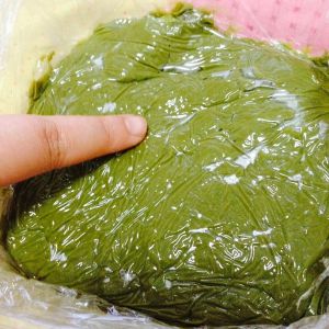找一个平面容器,将煮好的抹茶酱倒进去,用刮刀磨平抹茶酱,盖上保鲜膜(要贴着抹茶酱,不然抹茶酱的热气散发水蒸气会滴入抹茶酱里会变的湿湿的),冰箱冷藏半小时以上。取出即可食用。