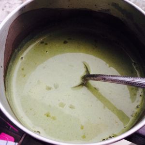 准备一个奶锅,倒入牛奶和抹茶粉搅拌均匀。开小火煮沸腾。(煮的时候可以紧接着做第二步骤)