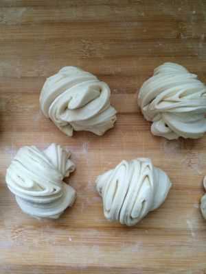 拧好的花卷。放入蒸锅,进行2次醒发30分钟。冬天时间要久一些。,