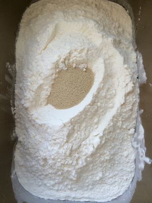 酵母放在面粉中间,加入水,启动和面程序,水要一点一点加,不要一次性加进去。