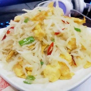 降温期间准备:葱,姜,鸡蛋,小红辣椒和香葱叶切成圈,将鸡蛋炒熟出锅备用,然后锅中倒入适量的油烧至七八成热,将葱姜小红辣椒圈放入,稍煸一下加入已凉好的土豆丝翻炒,然后加入炒熟的鸡蛋和香葱,继续翻炒,加入适量的盐、味精、鸡精,加入几滴香油翻炒均匀后出锅。