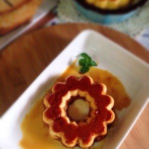 烤箱预热160度,中下层水浴法(就是将一个较深的烤盘注入热水高度1.5cm左右,放入布丁蛋糕)烤45分钟左右。出炉后稍稍放凉,找一个平盘覆在蛋糕容器上方,反转脱模