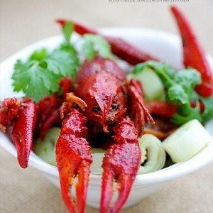炒出麻辣味道后,倒入小龙虾,炒至外壳变亮红色;将火锅底料掰成几块,加入锅中,充分炒匀