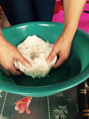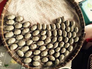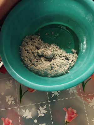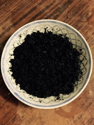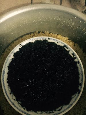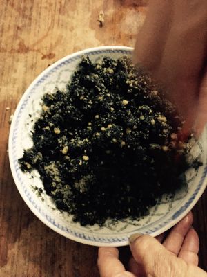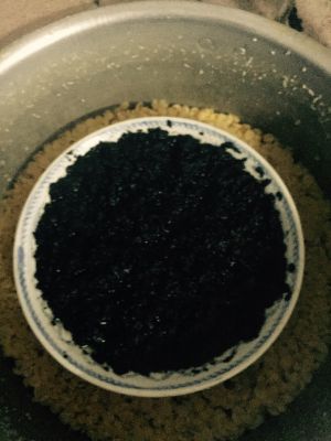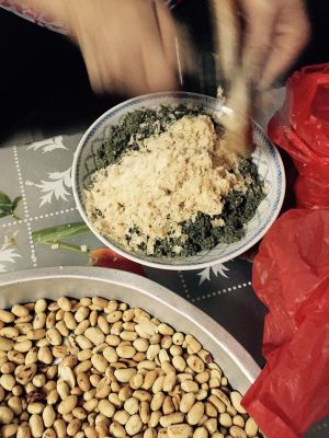 前期准备工作,首先去采摘新鲜的艾叶回来,摘掉老的梗留嫩的叶子和嫩嫩的梗,晒干后放锅里煮滚水,目的是去掉艾叶的苦味,再晾晒干,新摘的艾叶不能直接煮水,否则烂掉的,再起床干后,若太阳不够猛可以放锅盖上焊干爽,直到用手捏能捏碎,然后用石磨磨成粉状,或者用手搓碎后用铁盅锺碎,如图所示。