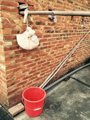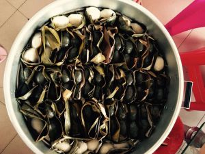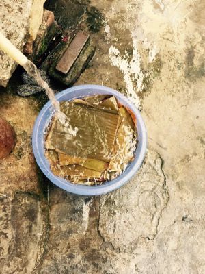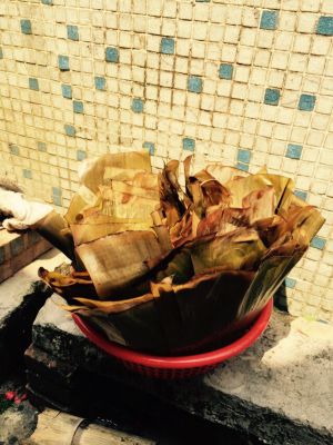 采摘蕉叶,必须是大蕉叶,回来煮熟,目的是去涩味,洗干净,用水泡着,保持湿度,裁剪好一块一块的放着备用