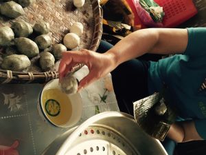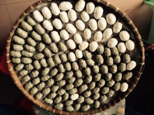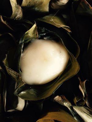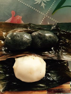 每个糍包裹前得过一点油,以免粘住蕉叶