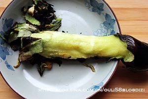 不时转动茄子和青椒,使其均匀受热成熟,将烤熟的茄子去掉表皮;