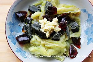 将皮蛋和茄子拌在一起,加入少许盐、蒜泥和少许酱油;