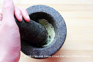 蒜臼里放少许盐,将剥皮的大蒜放入捣碎;