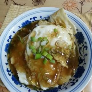 锅中倒少许油,将刚才煎好的鸡蛋倒入,稍微煎一下,