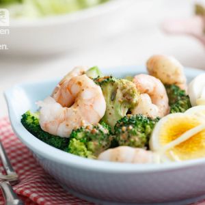 西兰花和虾仁放入料理碗中,撒上盐额黑胡椒,拌匀,淋上丘比焙煎芝麻沙拉汁,搅拌均匀。盛入盘中,旁边放上鸡蛋片,淋上丘比色拉酱。