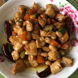 待葱段炒熟,倒入黄瓜丁、去皮的花生米和之前炒好的鸡块,然后倒入调好的料汁(酱油、醋、白糖、生粉、盐)。