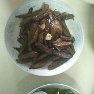 当茄子变色后放盐,此时茄子变扁,炒几下之后加入生抽,注意不要过多,放盐时也不能太多。(喜欢吃辣的可以加点豆瓣酱,但这道菜不加水而豆瓣酱又是咸的,所以要注意量)