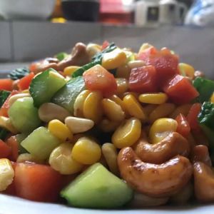 热锅冷油,放一点食用油烧至八成熟,下入玉米和胡萝卜丁,翻炒,加入盐,糖,蚝油调味,翻炒片刻,加入黄瓜丁翻炒