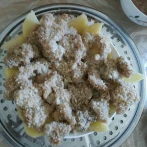 把土豆片摆在盘子下面打底,然后把肉放在土豆上面,放点葱姜蒜在肉上面。蒸上30分钟。出锅去除葱姜蒜。